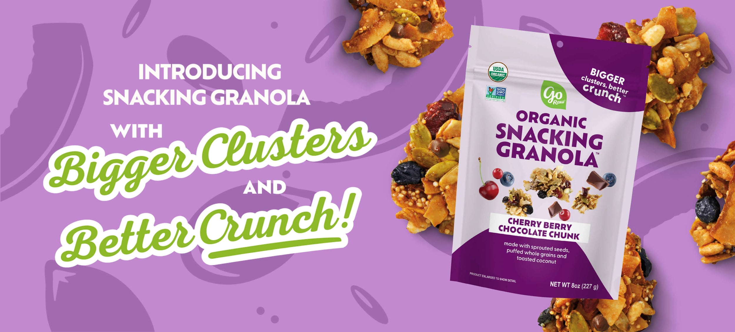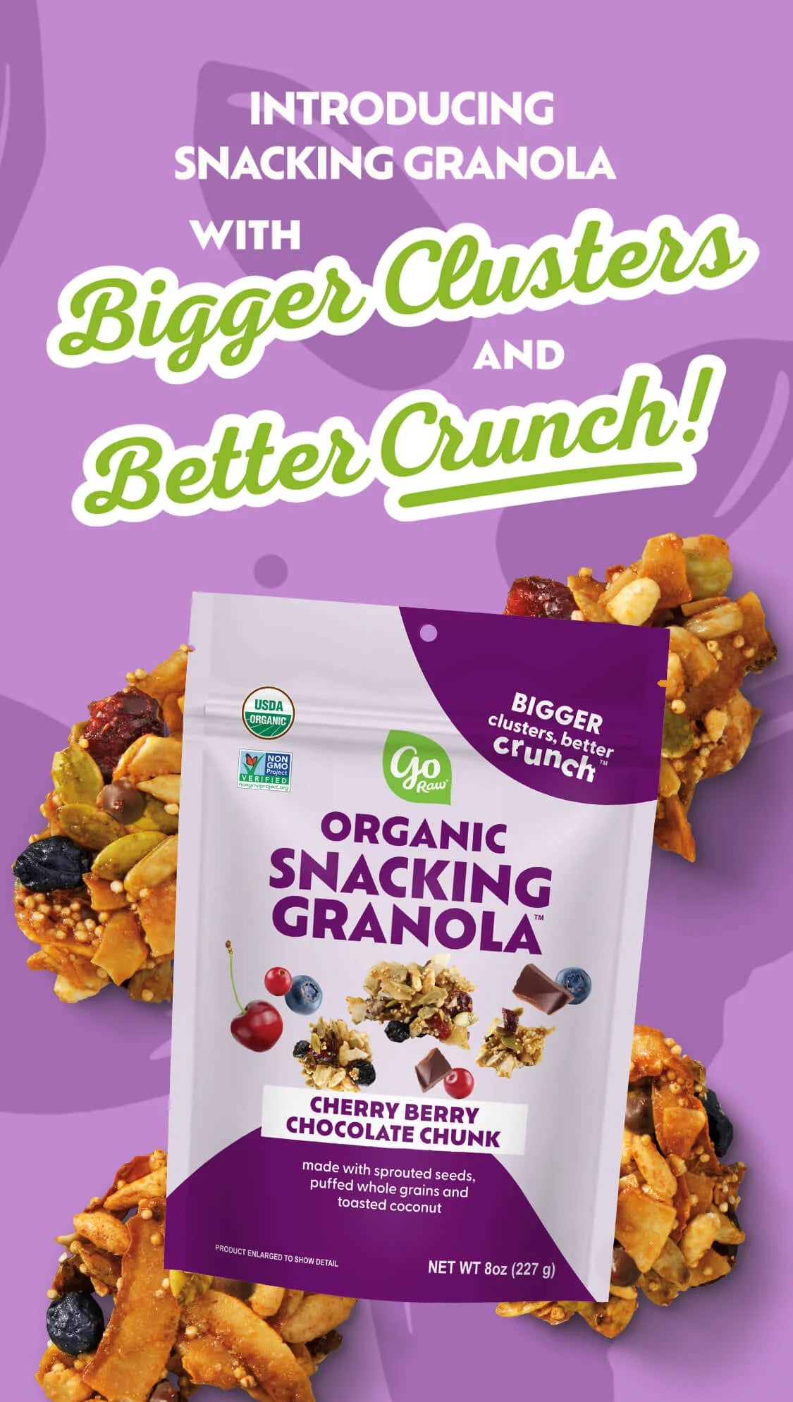Experience the ultimate snacking satisfaction anytime, anywhere with Go Raw’s new Organic Snacking Granola! Featuring bigger clusters and better crunch than traditional granola, our Snacking Granola is made with sprouted pumpkin and sunflower seeds, whole grains, and toasted coconut, making it light and crispy for superior snacking straight out of the bag!